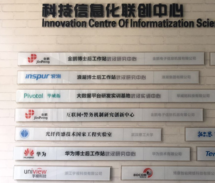 走進(jìn)武漢市公安局的科技信息化聯(lián)創(chuàng)中心,進(jìn)門右側(cè),掛著兩排金色的牌匾——華為博士后工作站武漢研究中心、浪潮博士后工作站武漢研究中心,屋里還掛著入駐中心的名錄,比如武漢理工光纖傳感技術(shù)國家工程實(shí)驗(yàn)室、阿里巴巴、奇虎360、騰訊、華為、金鵬等。