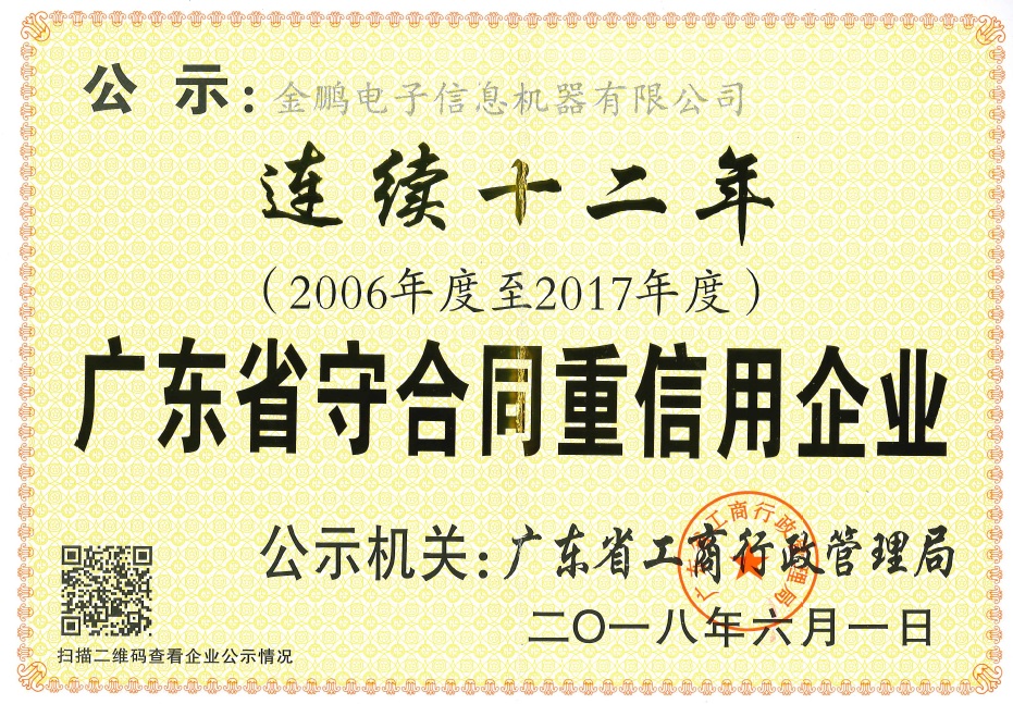近日,金鵬電子申報(bào)“守合同重信用企業(yè)”順利通過了廣州市工商行政管理局的審查,獲得2017年度“廣東省守合同重信用企業(yè)”稱號(hào),這已是金鵬電子連續(xù)12年獲此殊榮。