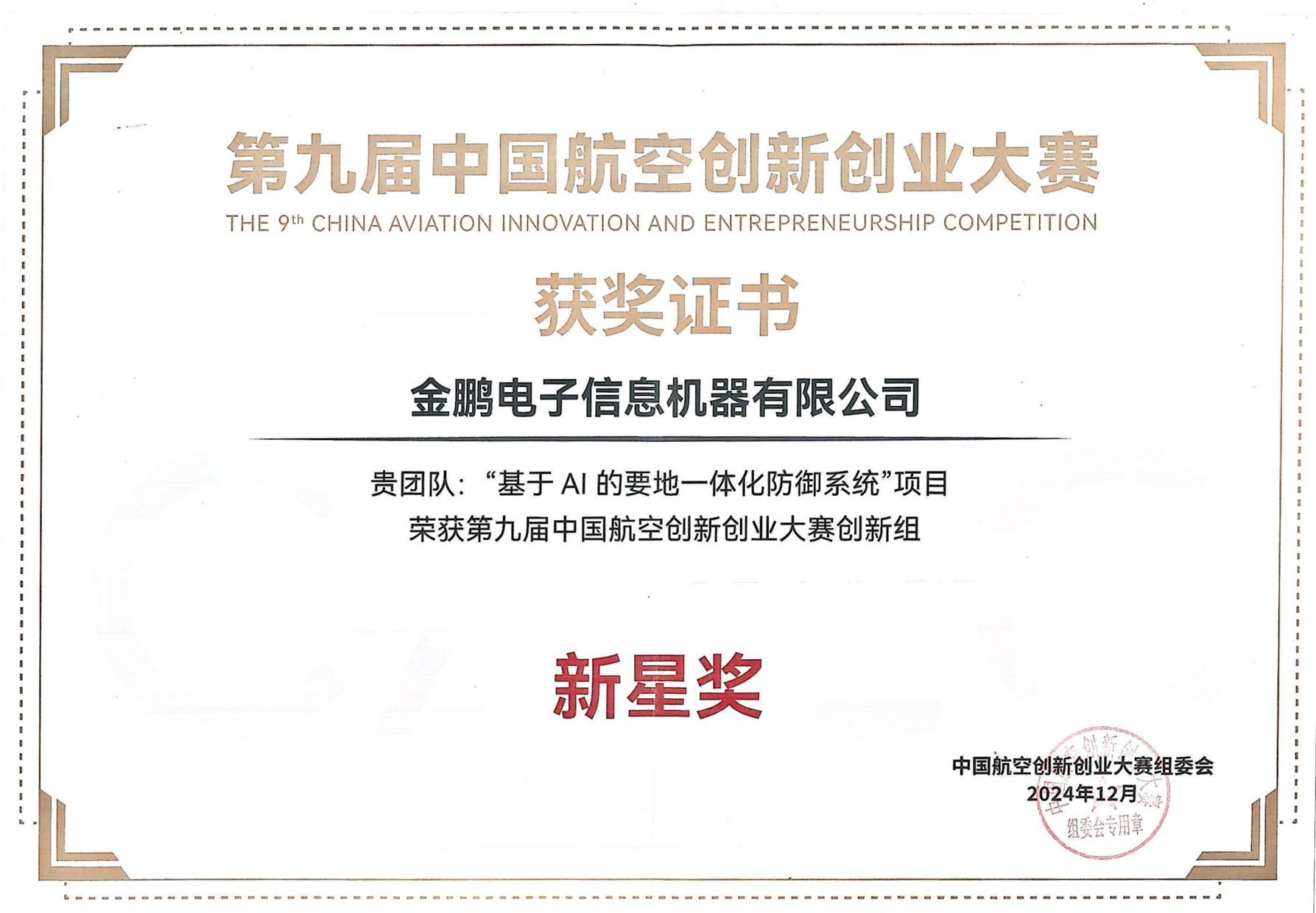 2024年12月28日,第九屆中國(guó)航空創(chuàng)新創(chuàng)業(yè)大賽圓滿落幕。 金鵬電子信息機(jī)器有限公司攜在低空安全領(lǐng)域全新打造的產(chǎn)品《基于AI 的要地一體化防御系統(tǒng)》首次亮相本次大賽,并一舉榮獲創(chuàng)新組新星獎(jiǎng)。