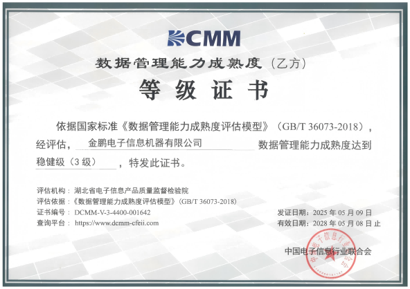 近日,金鵬電子信息機器有限公司通過了數(shù)據(jù)管理能力成熟度評估(Data Management Maturity Model,簡稱DCMM),獲得DCMM穩(wěn)健級證書,標(biāo)志著公司在數(shù)據(jù)管理領(lǐng)域的綜合實力得到了國家級權(quán)威機構(gòu)的認可。